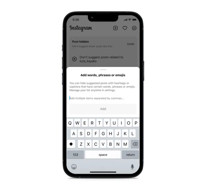 A outra adição que deve incrementar o direcionamento de conteúdo no Instagram é a opção de ocultar publicações com certas palavas, frases, emojis e hashtags na legenda. As palavras serão pré-determinadas pelos usuários, mas a empresa não entrou em detalhes sobre a seção dedicada ao recurso.