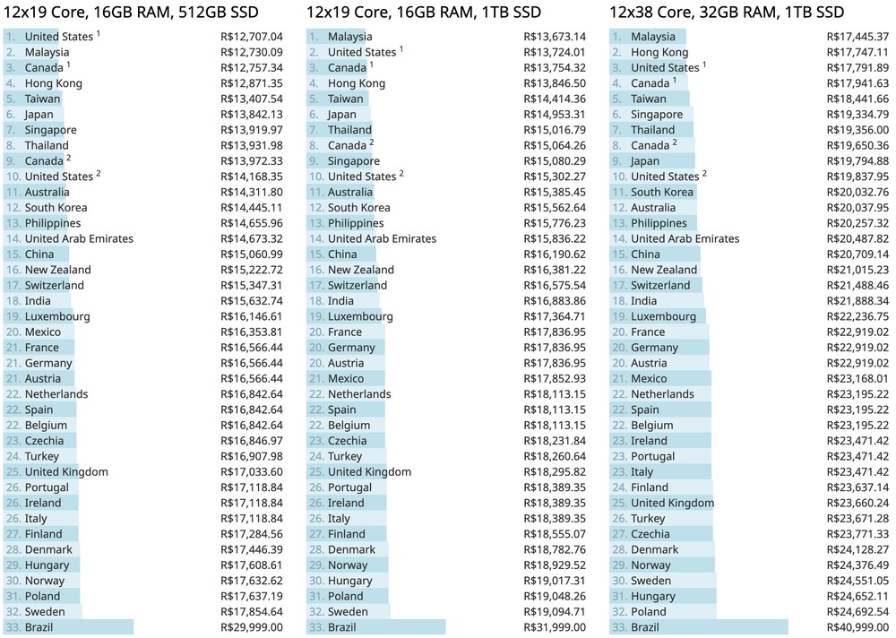 Algo que chama a atenção ao olhar os gráficos em cima dos nomes dos países nas tabelas é a grande diferença entre o Brasil e as demais nações analisadas, com o penúltimo das listas custando quase a metade do que é cobrado por aqui.